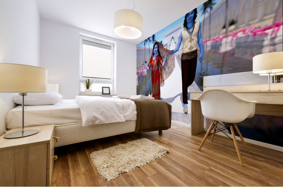 The image of Krishna and Radha entering the temple is a popular and symbolic scene in Hindu mythology and art. Krishna is considered an incarnation of the Hindu god Vishnu and is often depicted as a divine figure with human qualities, such as compassion, playfulness, and love. Radha is considered a goddess and is often depicted as a symbol of devotion and worship. In the scene, we see Krishna and Radha walking towards a temple, which is often seen as a sacred space for worship and spiritual practice. The act of entering the temple can be interpreted as a symbolic representation of the journey towards spiritual enlightenment and union with the divine. The image can also evoke ideas about the importance of devotion and love in spiritual practice, as Krishna and Radha are often depicted as an embodiment of divine love and devotion. The image may also suggest ideas about the importance of community and shared spiritual practice, as entering the temple is often seen as a communal act. Overall, the image of Krishna and Radha entering the temple can inspire us to think about the role of spirituality and devotion in our own lives, as well as the ways in which our personal journeys towards enlightenment and union with the divine are interconnected with the larger community of spiritual seekers.
